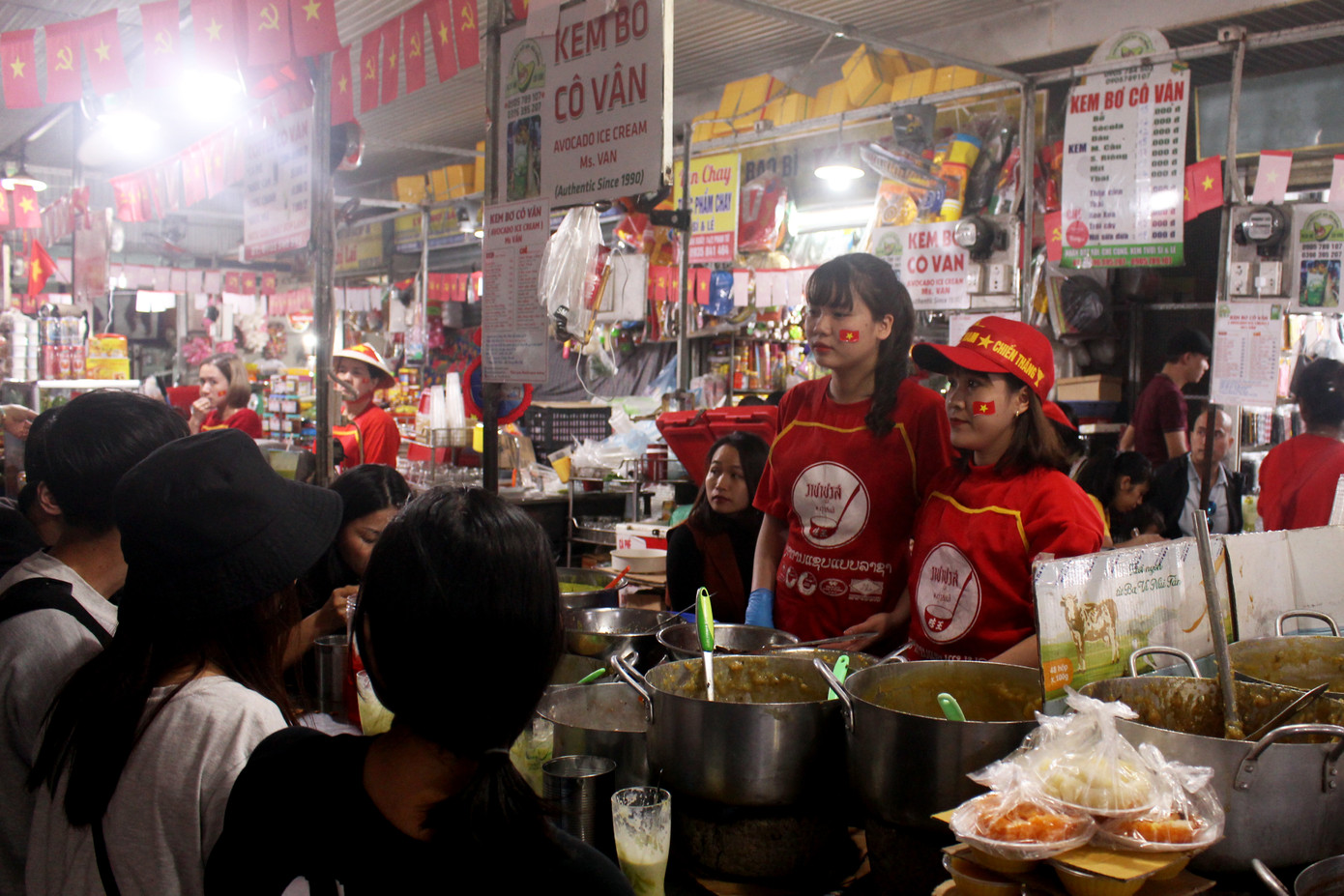 Các tiểu thương ở đây đều mặc áo cờ đỏ sao vàng, đeo băng đô cổ vũ, dán sticker lên má... để bán hàng. Không khí sôi động thu hút sự chú ý của nhiều du khách nước ngoài tại khu chợ