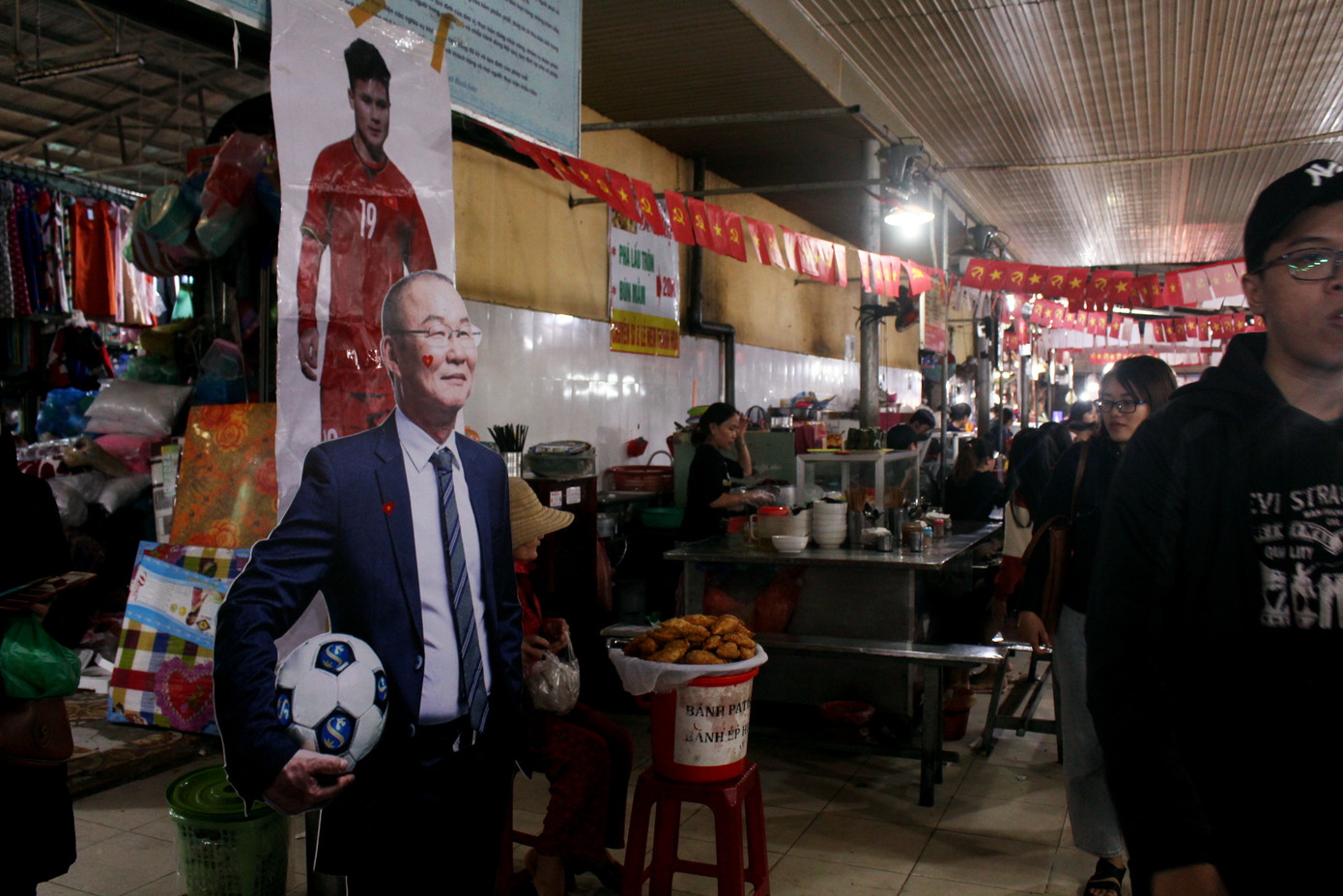 HLV Park Hang Seo cùng ngôi sao của U22 Việt Nam Nguyễn Quang Hải án ngữ ngay lối vào khu ẩm thực của chợ Bắc Mỹ An, nhiều người dân và du khách thích thú và chụp hình checkin ở đây.
