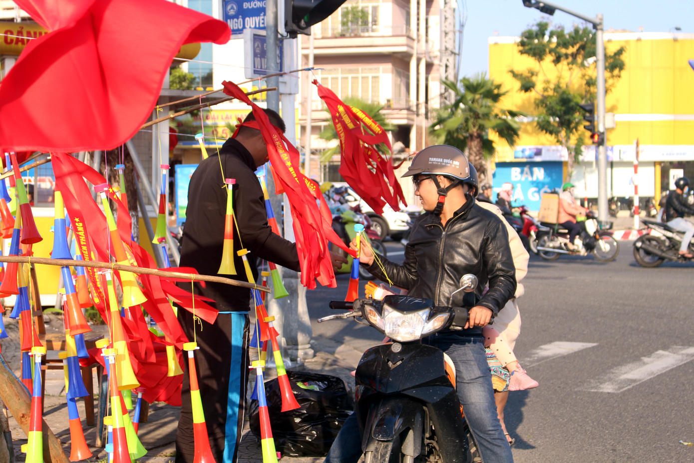 Chiều 10/12, các tuyến đường lớn ở Đà Nẵng rực sắc đỏ. Cờ Tổ quốc, áo cờ Tổ quốc hay băng đô cổ vũ, kèn.... được bày bán dọc các khu vực ngã tư ở trung tâm thành phố như Võ Văn Kiệt - Ngô Quyền, bùng binh cầu sông Hàn.....