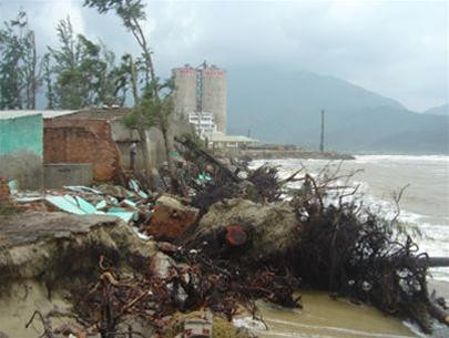 Theo ghi nhận của PV tại hiện trường chiều 17/12, toàn bộ nhà ở cùng trại tôm giống của hơn mười hộ dân nơi đây đã bị sóng đánh sập một phần. Hàng trăm cây dương liễu lớn đã bị xói lở, cuốn trôi ra biển.