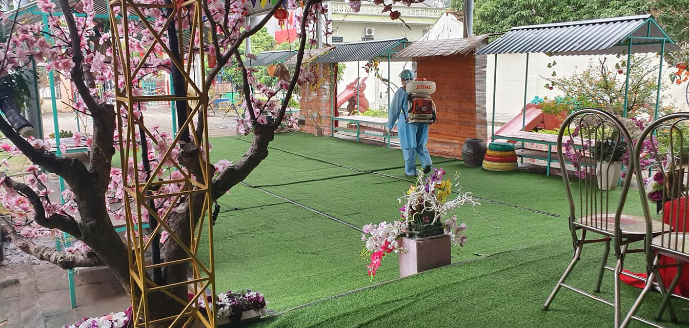 Nhân viên y tế phun thuốc khử trùng tại trường Mầm non Bình Minh.