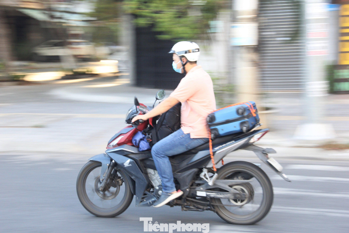 | Ghi nhận trên các tuyến đường Đà Nẵng, hầu hết người đi làm đều chở theo vali áo quần, thực phẩm, quạt… để ở lại nơi làm việc . |