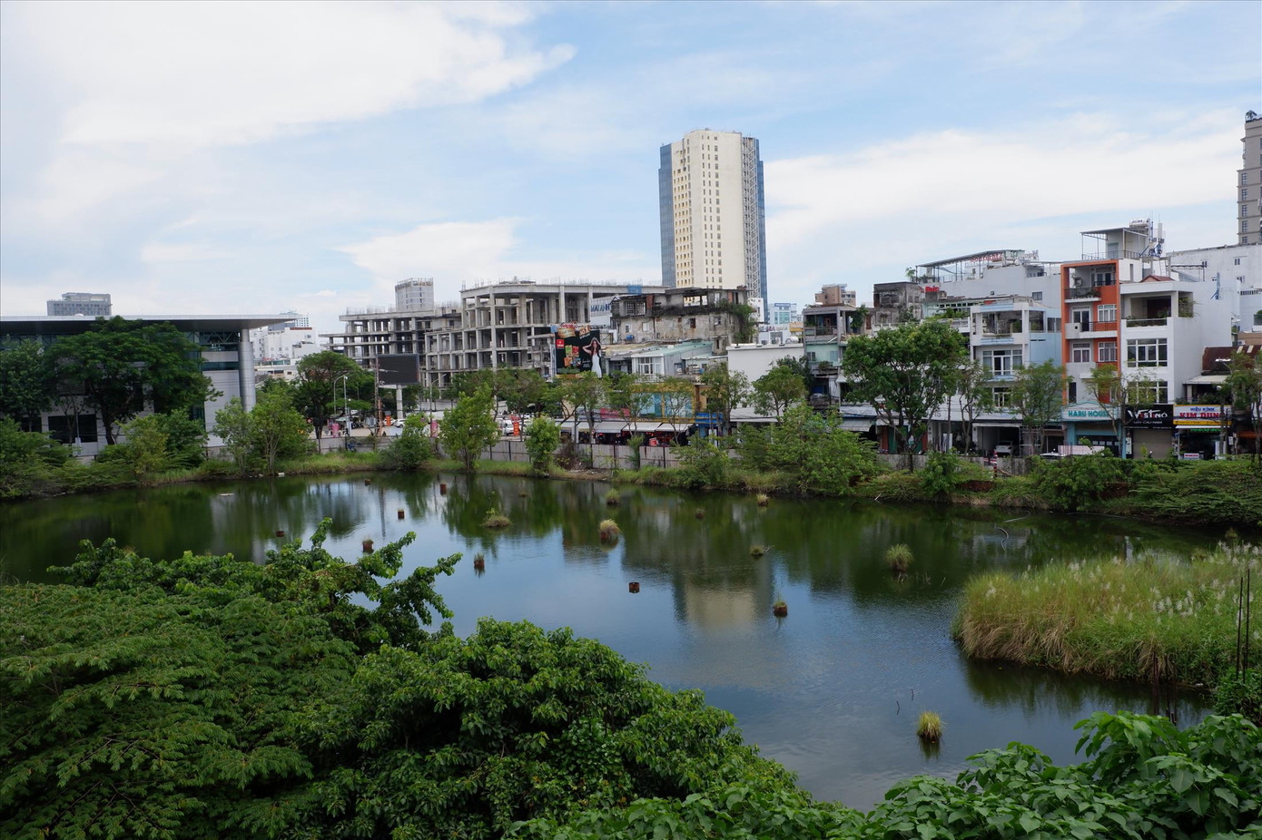 | Dự án Đà Nẵng Center hiện trạng là hồ nước, phía xa là dự án Golden Square bỏ hoang giữa trung tâm Đà Nẵng. Ảnh: Nguyễn Thành |
