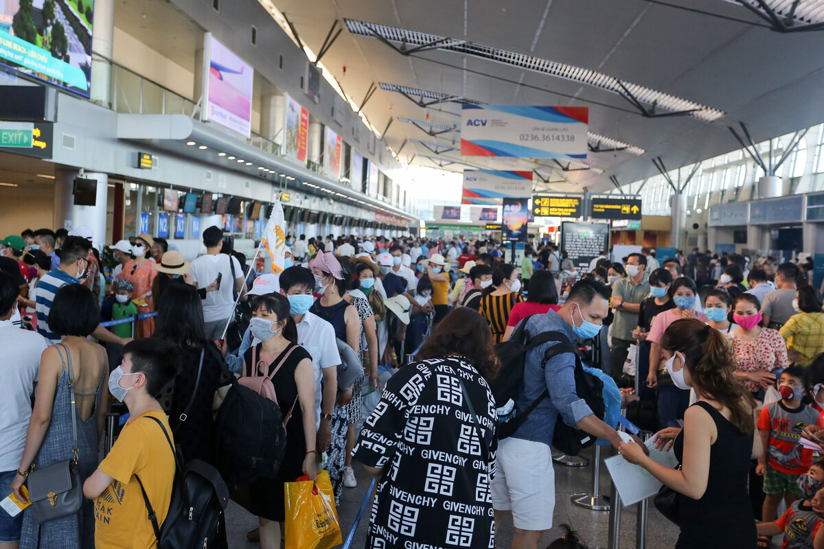 Khách đến và đi bằng đường hàng không cũng đông đúc. Mọi người đều chấp hành việc đeo khẩu trang. Ông Hoàng Hữu Cương, Phó giám đốc cảng hàng không quốc tế Đà Nẵng, cho biết lượng khách ngày 24/7 không tăng bất thường so với mấy tuần trở lại đây. Trung bình mỗi ngày sân bay có 40.000 lượt khách làm thủ tục, tăng 138% so với cùng kỳ năm 2019.