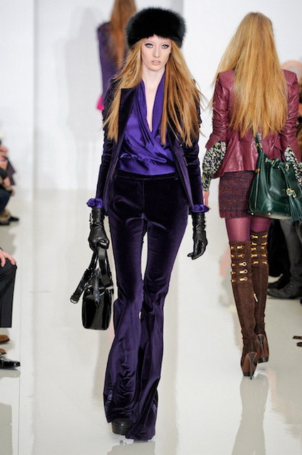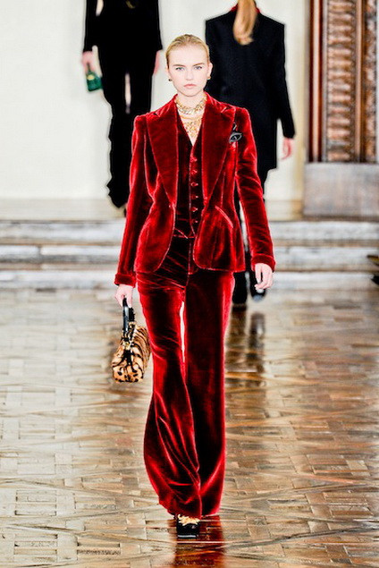 Ralph Lauren luôn có cách riêng để thể hiện cá tính trên từng thiết kế của mình. Sử dụng chất liệu nhung “từ trong ra ngoài” để tạo thành một bộ suit hoàn chỉnh, NTK lựa chọn gam màu đỏ nổi bật. Áo gi-lê, quần ống loe, áo vest cắt khéo và chiếc khăn tay màu xám nơi túi áo – có vẻ như Ralph Lauren rất yêu thích xu hướng menswear khi gửi tặng mẫu thiết kế này tới phái đẹp.