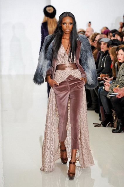 Đa số mọi người khi lựa chọn vải nhung đều chọn những gam màu đậm, như tím, đen, đỏ ru-by hay xanh ngọc… Hãy thử làm mới mình với một bộ suit sử dụng chất liệu nhung màu hồng ánh lên những tia bạc thật lãng mạn và khó cưỡng. Với bộ trang phục này, NTK còn tạo điểm nhấn với áo khoác lông thú xa xỉ - rất phù hợp cho những ngày đông giá rét.