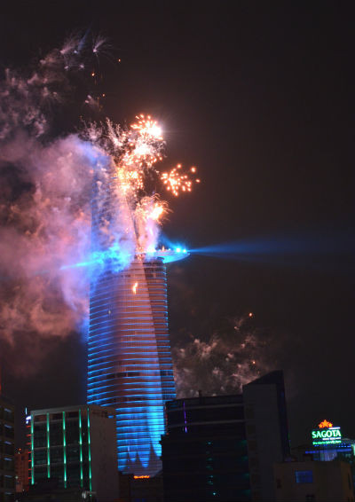 Có lẽ do sự cố kỹ thuật, chương trình pháo hoa nghệ thuật từ tháp Bitexco- tòa nhà cao nhất Sài Gòn- tới khoảng 10h5’ mới chính thức bắt đầu từ tầng 52, sân đỗ trực thăng của tòa nhà này, cách mặt đất 191m. Trong gần 20 phút, hàng vạn công chúng đứng ken chật trong các ngả phố đã được chặn ô tô, trở thành phố đi bộ say sưa theo dõi vẻ đẹp tạo hình nghệ thuật của các sắc thái pháo hoa. Nhiều khu vực dân cư ở xa tòa tháp cũng thấy rõ pháo hoa tạo hình ngôi sao, trái tim… rực rỡ muôn màu trên nền trời Sài Gòn, như công viên 23/9 chợ Bến Thành, công viên hầm vượt sông Sài Gòn, cầu Thủ Thiêm (Q.2), các đường Hàm Nghi, Tôn Đức Thắng, Nguyễn Huệ.