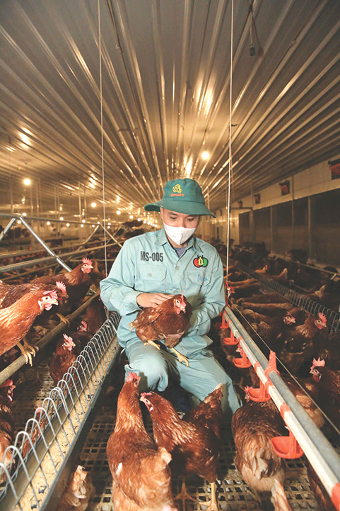 | Công nhân theo dõi sức khỏe đàn gà, điều chỉnh nhiệt độ, độ ẩm, lượng thức ăn hàng ngày |