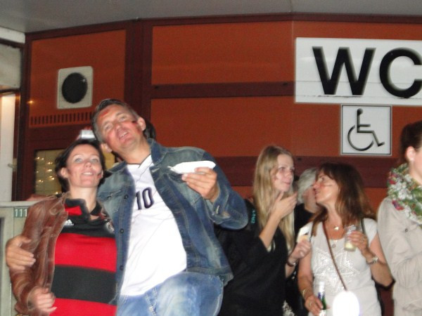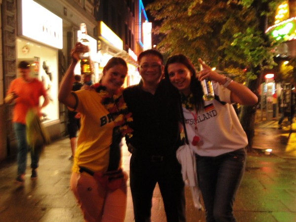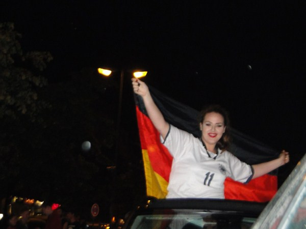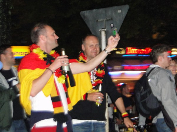Trên hè phố, mặc dù trời mưa người dân khoác cờ Đức đổ ra đường mỗi lúc một đông. Tuy nhiên, không hề có cảnh lộn xộn hay gây rối xảy ra, mọi người đều rất thân thiện, cởi mở, uống bia và hô vang “Deutschland, Deutschland” (nước Đức).