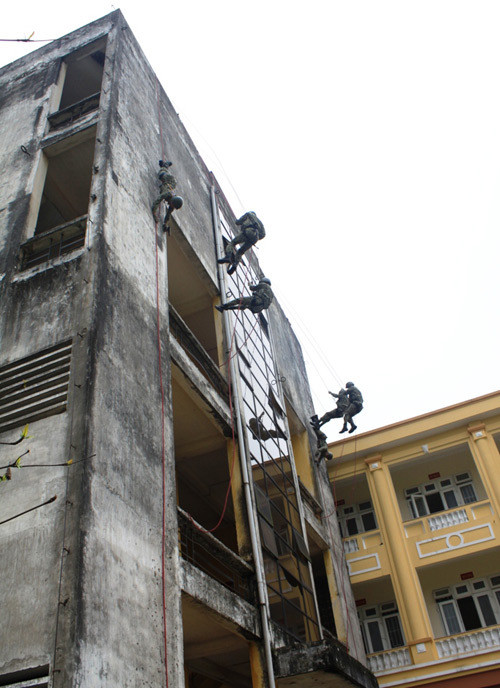Tiếp cận mục tiêu tiêu diệt lực lượng khủng bố trong diễn tập giả định.