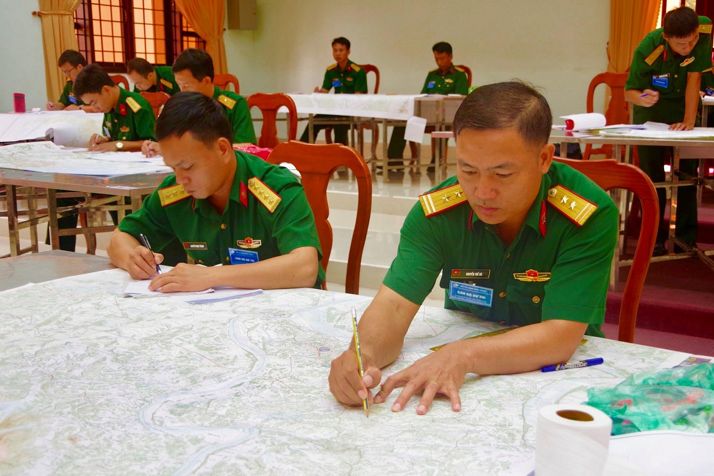 Các thi sinh tham gia thi nội dung soạn thảo kế hoạch chiến đấu và Nghị quyết lãnh đạo thực hiện nhiệm vụ chiến đấu.