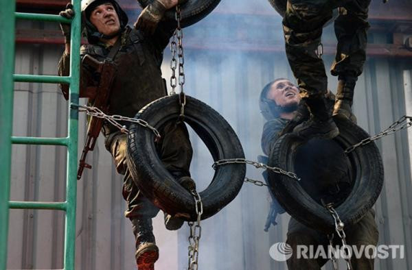 Sau đó phải tham gia vào giai đoạn tiếp theo về kiểm tra khả năng sẵn sàng chiến đấu và vượt qua vô số các chướng ngại vật khác nhau. Cảnh các binh sĩ đang trong bài kiểm tra tác chiến (Nguồn: Rian.ru).