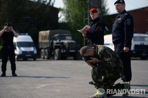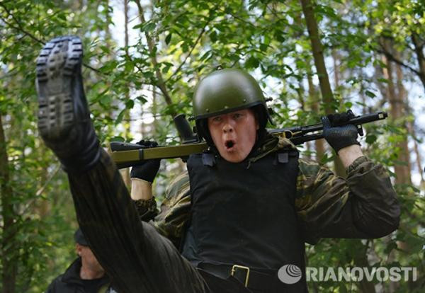 Đợt sát hạch, tuyển lựa này năm nay có 12 lính Bộ Nội vụ Nga tham gia với sự hỗ trợ từ các đồng nghiệp cũng như các đại diện từ phía cảnh sát chống bạo động. Trong ảnh là các binh sĩ đang so găng quyền Anh trực diện (Nguồn: Rian.ru). Các binh sĩ tham gia được trang bị quân tư trang phù hợp với từng bài đánh giá. Ban đầu 12 binh sĩ này sẽ phải chạm trán với 9 lính đặc nhiệm với vai trò giả định là kẻ thù (Nguồn: Rian.ru).