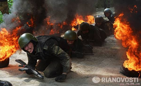 Đây là các hoạt động vừa diễn ra hôm 25-26/5 nhằm thực hiện sát hạch chất lượng xem trong số các binh sĩ Lực lượng đặc nhiệm OMON thuộc Bộ Nội vụ Nga ở vùng Sverdlovsk ai có đủ trình độ và vinh dự được đội mũ nồi đen. Ảnh binh sĩ OMON trong đợt kiểm tra đang thực hiện việc vượt chướng ngại vật là các tường lửa cháy, nóng bỏng rực (Nguồn: Rian.ru).