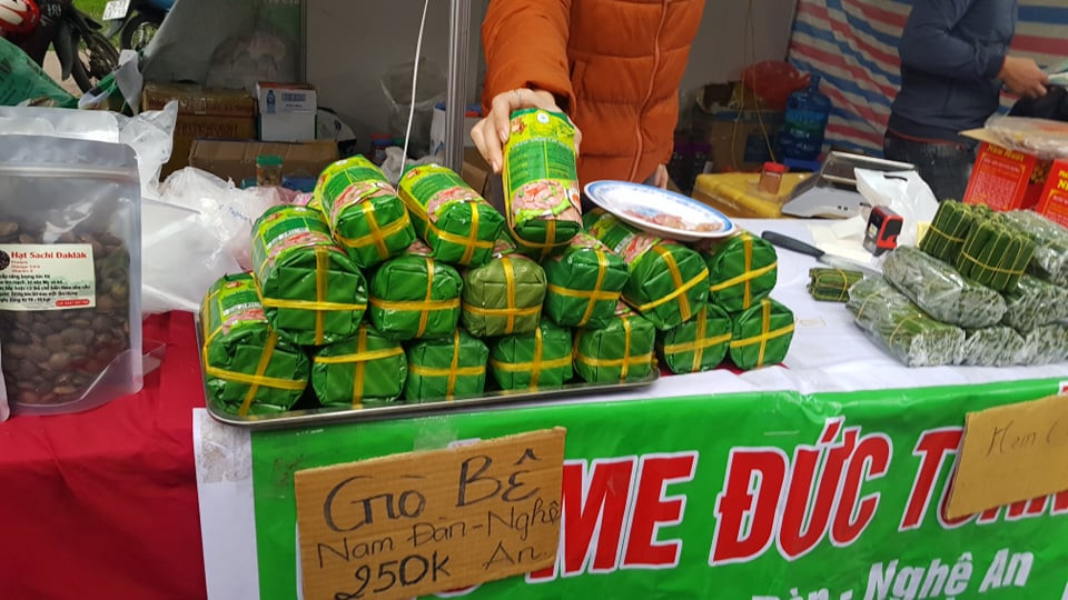 Giò bê là đặc sản Nghệ An được nhiều người dân Hà Nội ưa chuộng cho bữa ăn ngày Tết. Giá giò bê 250.000 đồng/kg và được gói thành bó nửa kg hoặc một kg.