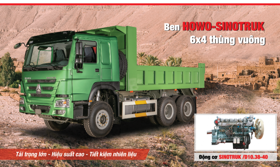 Xe ben Howo-Sinotruk 6x4 sở hữu động cơ D10.38-40 theo tiêu chuẩn khí thải Euro IV, trang bị turbo tăng áp, đạt công suất cực đại 380 Ps tại 2.000 vòng/phút, đồng thời ứng dụng công nghệ phun nhiên liệu điều khiển bằng điện tử (commonrail), giúp cho động cơ đạt công suất tối ưu và vô cùng tiết kiệm nhiên liệu. Bên cạnh đó, sự kết hợp nhịp nhàng với khung sát-xi làm bằng thép cường lực cao, nhằm tăng độ cứng chắc và độ bền cho khung xe, từ đó giúp xe có khả năng chịu tải lớn nhưng vẫn đảm bảo vận hành an toàn.