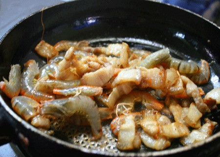 - Tôm cắt bỏ râu, đuôi, rửa sạch. Thịt ba chỉ rửa sạch thái sợi vừa ăn. Phi thơm dầu, cho tôm và thịt vào xào sơ qua.
