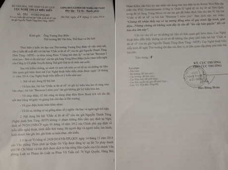 Ông Đào Đăng Hoàn, Phó Cục trưởng Cục Nghệ thuật Biểu diễn cũng cho biết, ngày 21/11 Cục đã gửi văn bản lên ông Vương Duy Biên, Thứ trưởng Bộ VH,Tt&DL về trường hợp của ca sĩ Sơn Tùng M-TP.