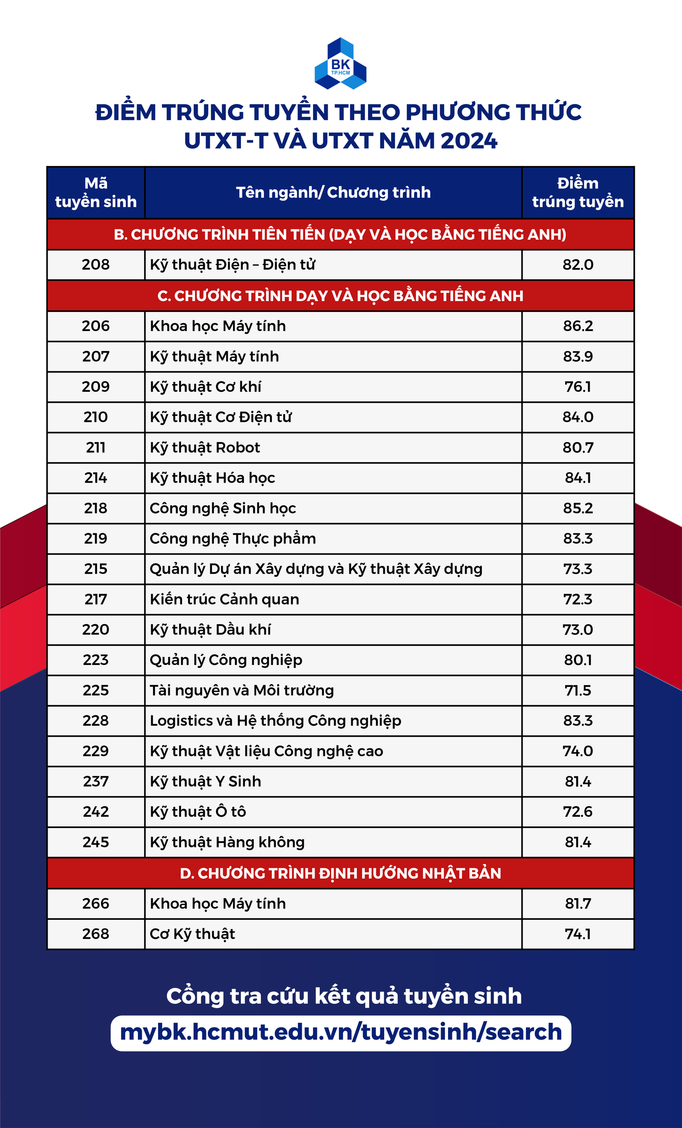 Trường xét thí sinh theo tổng điểm trung bình các môn thuộc tổ hợp môn xét tuyển của các năm lớp 10, 11, 12 (thang điểm 90), theo bài luận, thư giới thiệu (phương thức 2). Trong tổng số 44 ngành xét tuyển có 6 ngành lấy điểm chuẩn trên 85 và 21 ngành có điểm chuẩn trên 81 (trung bình mỗi môn trong tổ hợp xét tuyển phải đạt 9,0 điểm). Ngành có điểm chuẩn cao nhất là khoa học máy tính chương trình tiêu chuẩn với tổng điểm 86,7.