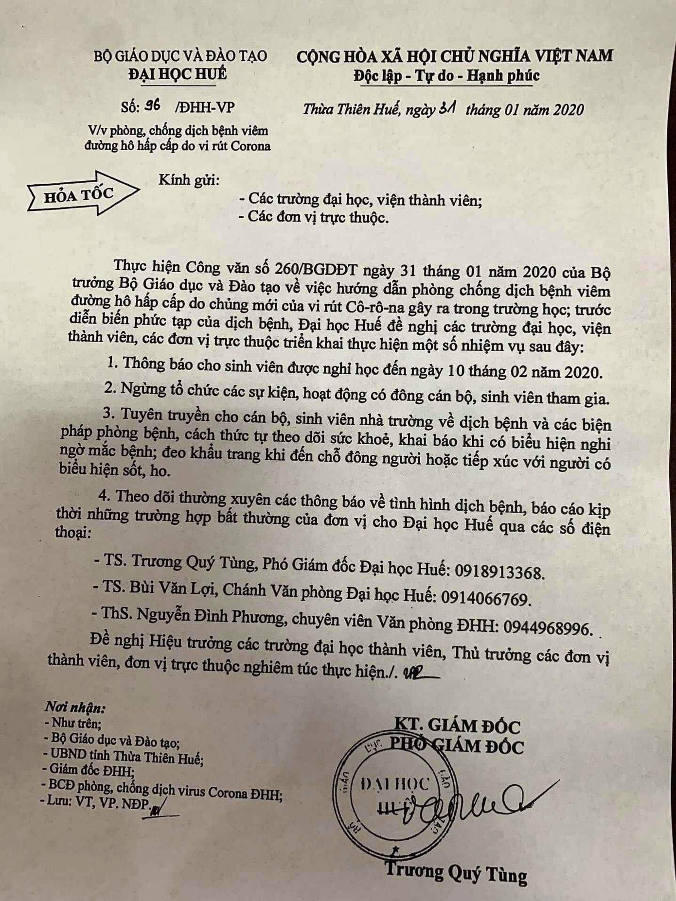 Văn bản số 96/ĐHH-VP do Phó Giám đốc Đại học Huế Trương Quý Tùng ký ban hành ngày 31/1 nêu rõ, thực hiện Công văn số 260/BGDĐT ngày 31/1/2020 của Bộ trưởng Bộ Giáo dục và Đào tạo về việc hướng dẫn phòng chống dịch bệnh viêm đường hô hấp cấp do chủng mới của virus Corona gây ra trong trường học, trước diễn biến phức tạp của dịch bệnh, Đại học Huế đề nghị các trường đại học, viện thành viên, các đơn vị trực thuộc triển khai thực hiện thông báo cho sinh viên được nghỉ học đến ngày 10/2.