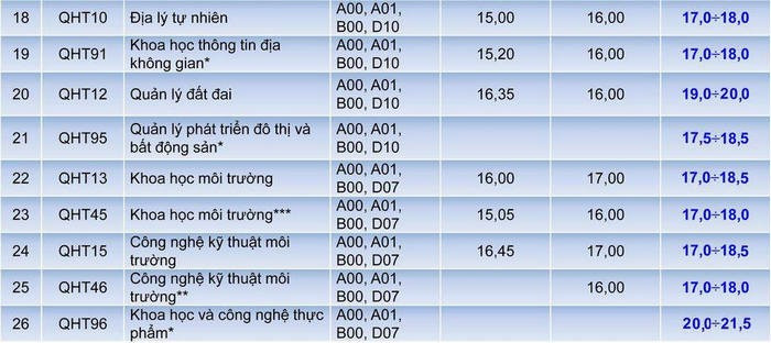 Những chương trình đào tạo khác có điểm chuẩn từ 20 trở lên bao gồm: Toán học, Toán Tin, Máy tính và Khoa học Thông tin (CTĐT chất lượng cao), Hóa học, Công nghệ Kỹ thuật Hóa học, Hóa Dược (CTĐT chất lượng cao), Sinh học. Các chương trình đào tạo còn lại có điểm chuẩn dao động từ 16 - 18,75 điểm.