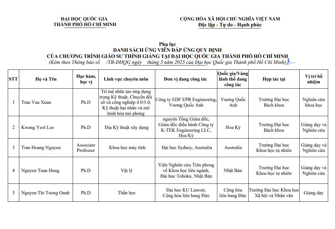Mới đây, ĐHQG TP.HCM vừa công bố danh sách 12 giáo sư quốc tế được tuyển chọn trong đợt 2 của Chương trình Giáo sư thỉnh giảng năm 2025. Đây đều là những nhà khoa học hàng đầu đến từ các đại học danh tiếng như ĐH Oxford, ĐH Harvard, ĐH Sydney, ĐH Tohoku, ĐH KU Leuven, trường ĐH Tours, ĐH Sains Malaysia cùng nhiều viện nghiên cứu và doanh nghiệp công nghệ tại Anh, Mỹ, Nhật Bản, Pháp, Bỉ, Đức, Malaysia và Australia.