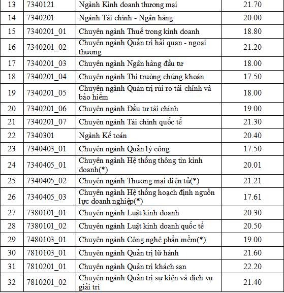 (*) là tổ hợp xét tuyển có môn nhân hệ số 2, quy về thang điểm 30.