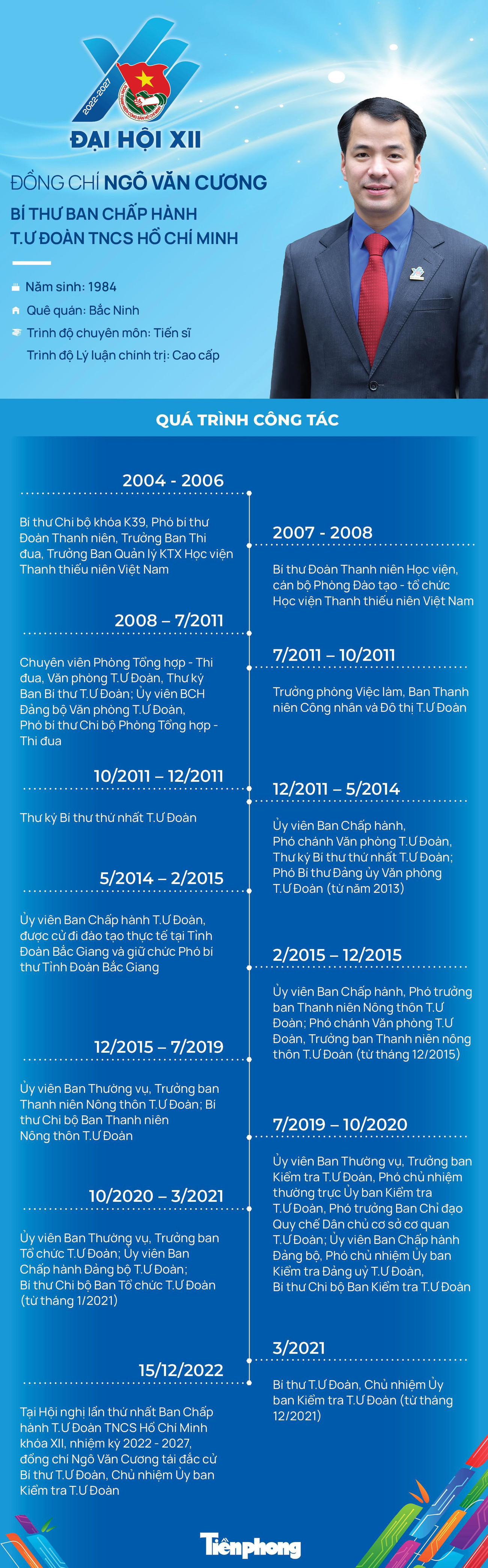 TPO - Ban Bí thư T.Ư Đoàn khóa XII nhiệm kỳ 2022 - 2027 gồm 6 anh, chị. Anh Ngô Văn Cương, Bí thư T.Ư Đoàn khóa XI, được tín nhiệm bầu tái đắc cử Bí thư T.Ư Đoàn khóa XII.