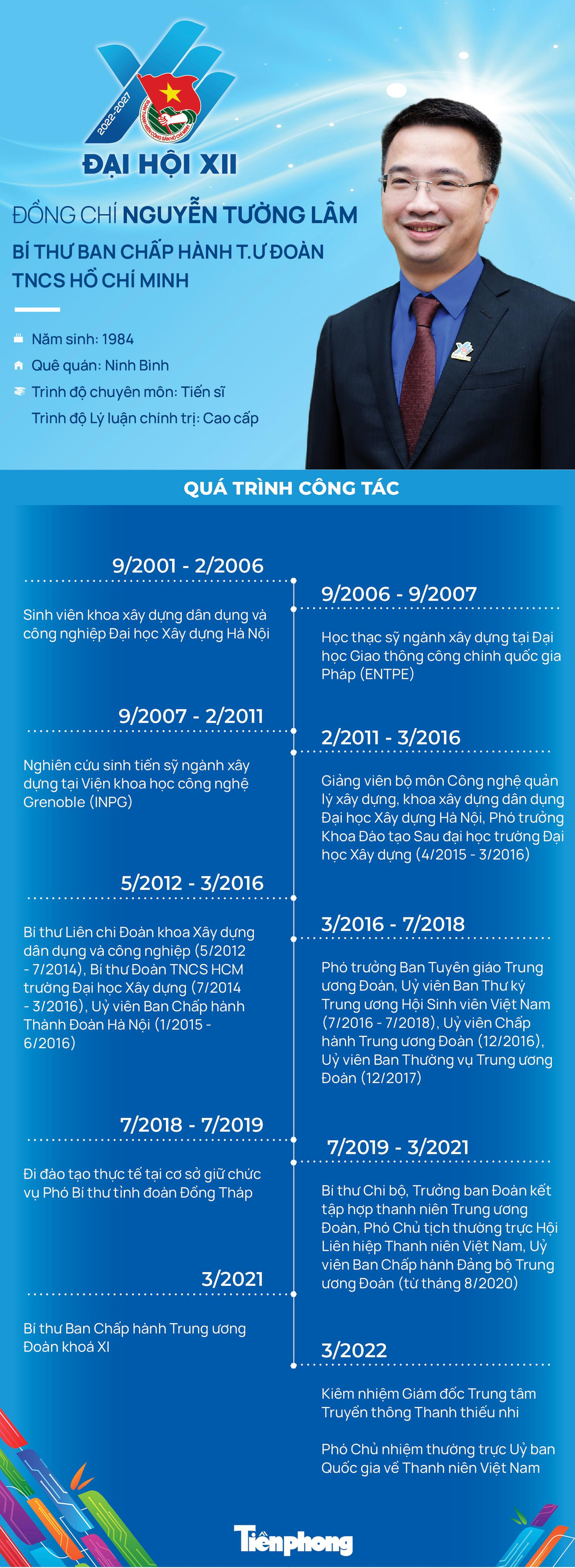 TPO - Ban Bí thư T.Ư Đoàn khóa XII nhiệm kỳ 2022 - 2027 gồm 6 anh, chị. Anh Nguyễn Tường Lâm, Bí thư T.Ư Đoàn khóa XI, được tín nhiệm bầu tái đắc cử Bí thư T.Ư Đoàn khóa XII.