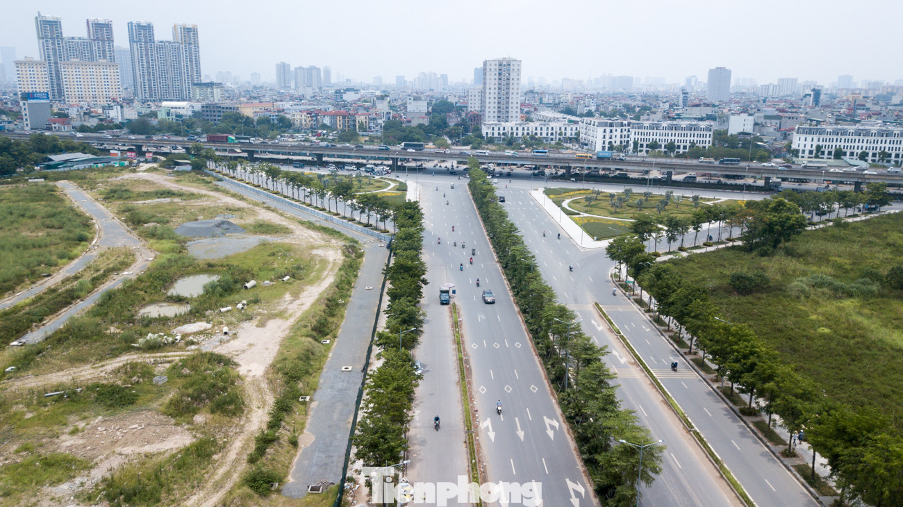 Khung cảnh nhìn từ trên cao tuyến số 1 thuộc Dự án đường giao thông bao quanh khu tưởng niệm danh nhân Chu Văn An (Thanh Trì) đã được thông xe phục vụ người dân đi lại. Đây là tuyến đường kết nối từ Vành đai 3, đoạn Nguyễn Xiển đến đường Phan Trọng Tuệ.