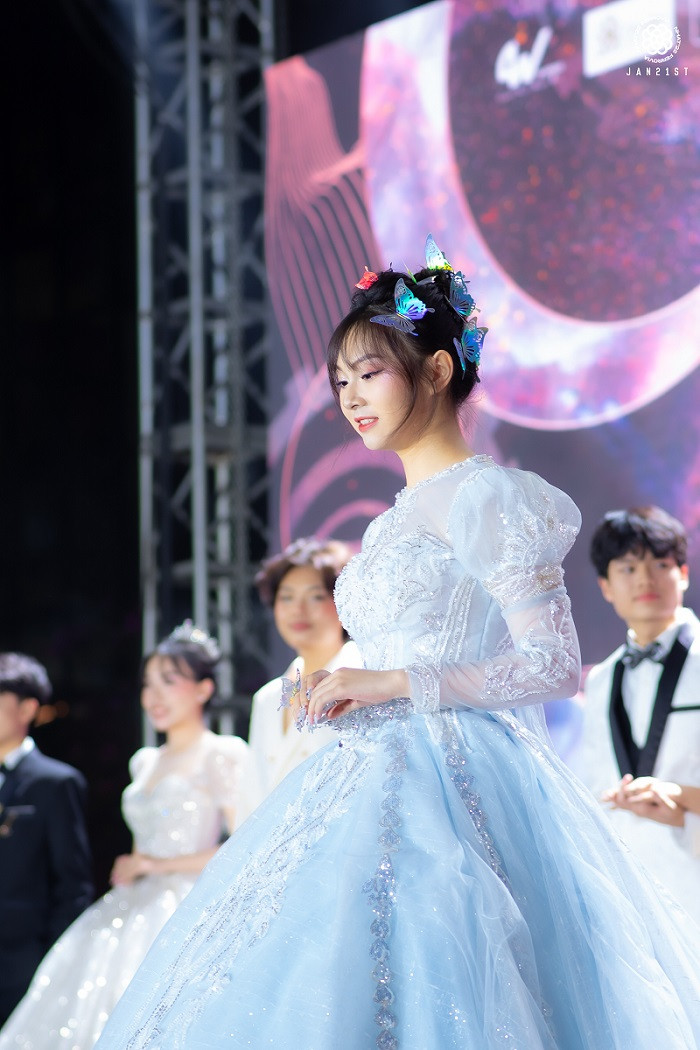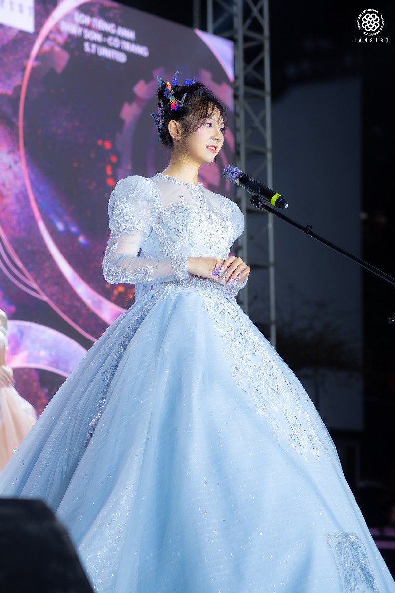 Xuất hiện tại đêm Chung kết với chiếc đầm dạ hội màu lam nhạt, Châu Giang một lần nữa khiến teen xuýt xoa với nhan sắc ngọt ngào, trong trẻo.