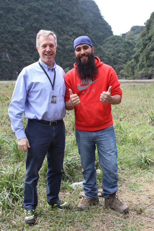 Vào lúc nghỉ giữa giờ, Đại sứ Mỹ được thuyền máy đưa ra địa điểm ghi hình cách nơi chuẩn bị 200 mét. Ông chụp hình cùng đạo diễn Jordan Vogt-Roberts. Nhà làm phim đến từ thành phố Detroit chia sẻ rằng anh cảm thấy hạnh phúc vì cuối cùng đã đặt chân tới Việt Nam cùng êkíp hàng trăm thành viên. "Tôi yêu Việt Nam", anh nói to bằng tiếng Việt để bày tỏ sự phấn khích.