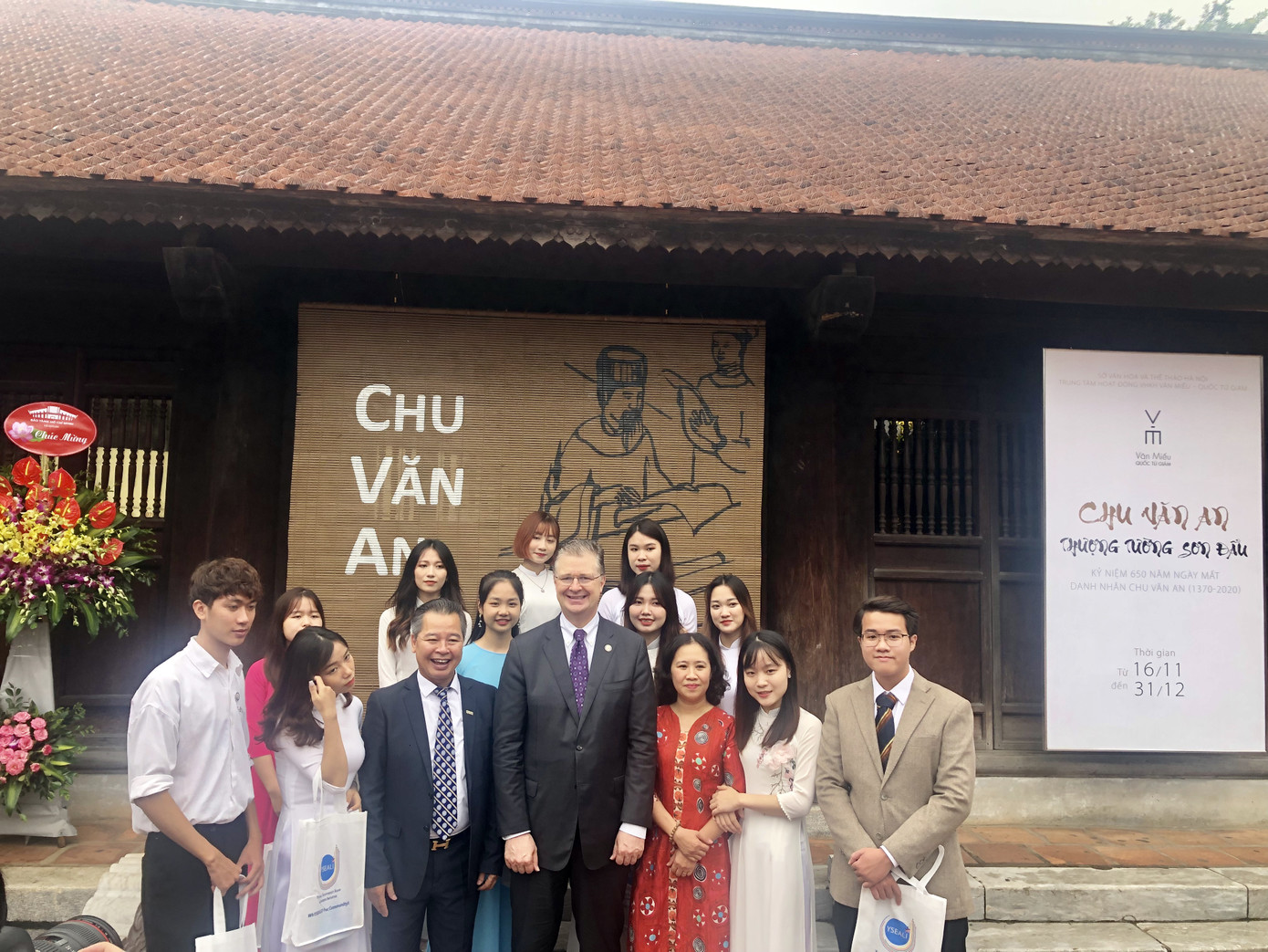 Đại sứ Kritenbrink, thầy Phạm Quang Minh và các sinh viên Đại học quốc gia Hà Nội tại triển lãm “ Chu Văn An- Thượng tường sơn Đẩu”.