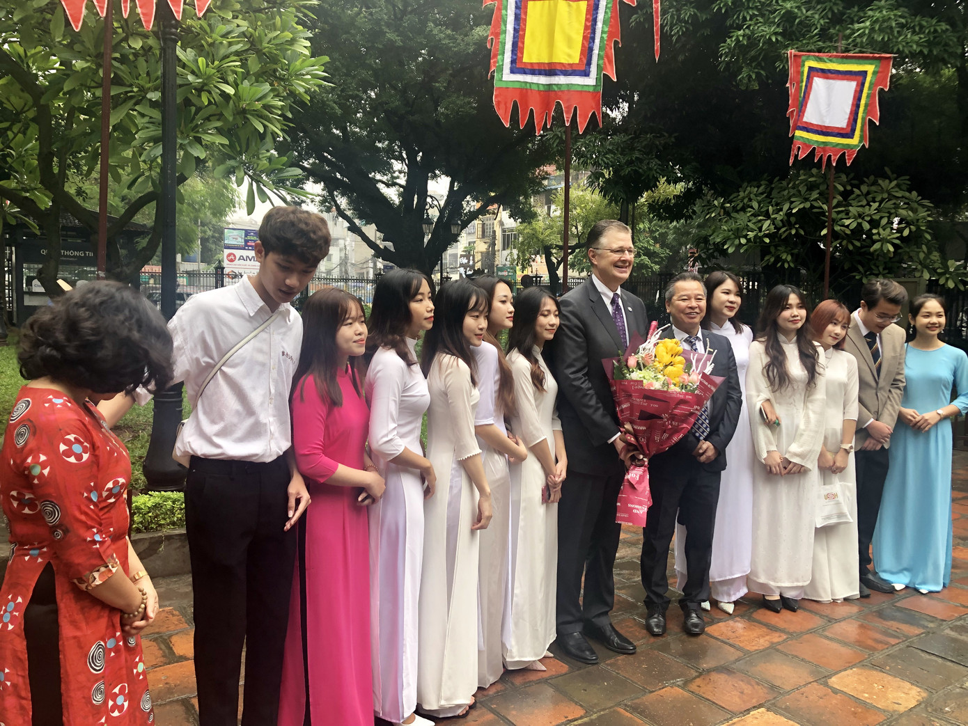 Đại sứ Kritenbrink được sinh viên Đại học quốc gia Hà Nội đón chào trước cửa Văn Miếu- Quốc Tử Giám. Ảnh: L.A