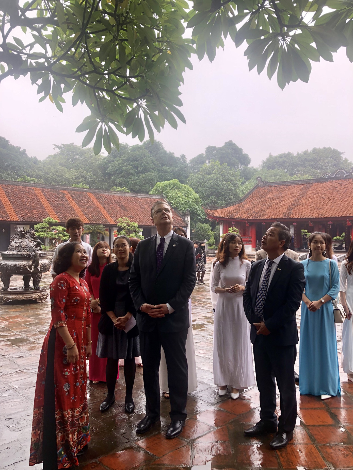 Đại sứ Kritenbrink rất ấn tượng với kiến trúc và khung cảnh thanh bình bên trong Văn Miếu- Quốc Tử Giám.