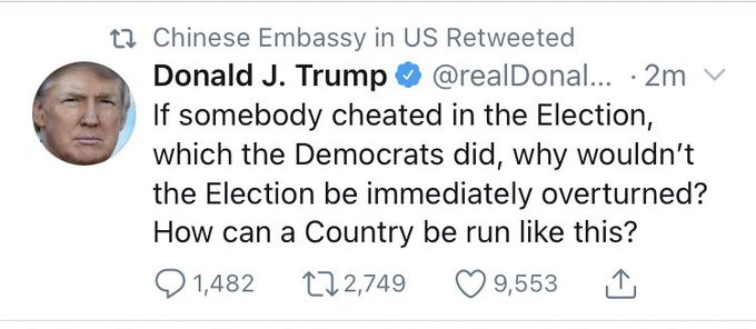 Dòng trạng thái của Tổng thống Trump sau đó bất ngờ được dẫn lại bởi trang Twitter chính thức của Đại sứ quán Mỹ tại Trung Quốc. Việc này có thể khiến nhiều người hiểu lầm, rằng đại sứ quán đồng tình với những cáo buộc chưa được kiểm chứng từ ông Trump.