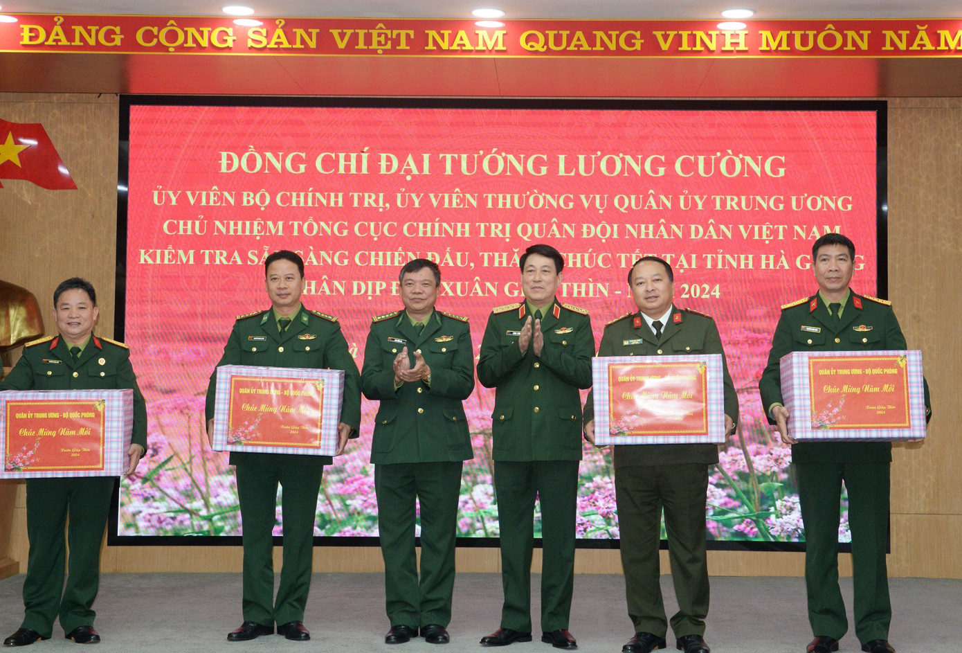 Nhân dịp chuẩn bị đón xuân mới - Giáp Thìn năm 2024, chiều cùng ngày, thay mặt lãnh đạo Đảng, Thường vụ Quân ủy Trung ương, lãnh đạo Bộ Quốc phòng và Tổng cục Chính trị QĐND Việt Nam, Đại tướng Lương Cường tới thăm, chúc Tết, trao quà tặng cán bộ, chiến sĩ lực lượng vũ trang trên địa bàn tỉnh Hà Giang và các gia đình chính sách, người có công tiêu biểu, hộ nghèo, công nhân lao động có hoàn cảnh khó khăn.