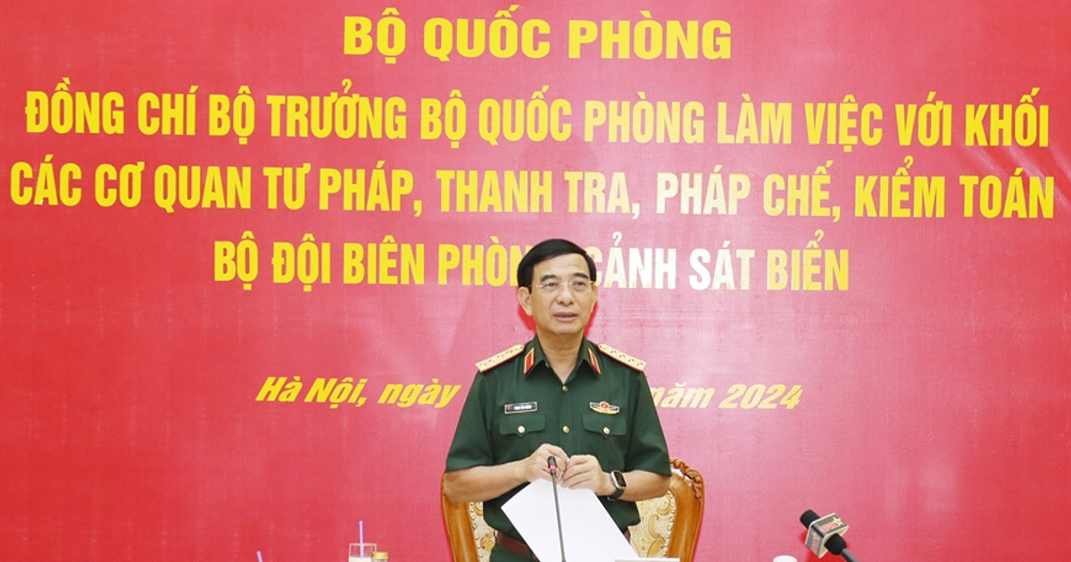 Ngày 6/6, tại Hà Nội, Đại tướng Phan Văn Giang - Ủy viên Bộ Chính trị, Phó Bí thư Quân ủy Trung ương, Bộ trưởng Bộ Quốc phòng, chủ trì làm việc với khối các cơ quan tư pháp, thanh tra, pháp chế, kiểm toán, Bộ đội Biên phòng, Cảnh sát biển. Tại buổi làm việc, Vụ Pháp chế (Bộ Quốc phòng) đã thông tin về kết quả thực hiện nhiệm vụ của các cơ quan, ngành, đơn vị từ đầu năm 2023 đến nay.