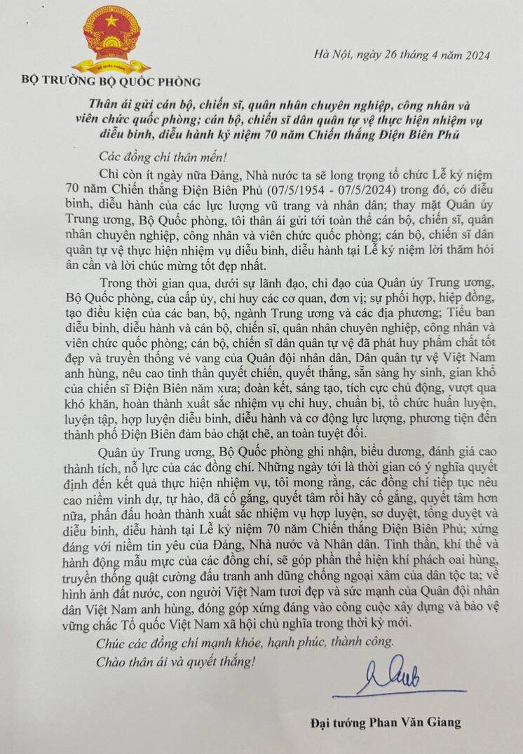 Trong thư, Đại tướng Phan Văn Giang nêu: Quân ủy Trung ương, Bộ Quốc phòng ghi nhận, biểu dương, đánh giá cao thành tích, nỗ lực của các đồng chí. Những ngày tới là thời gian có ý nghĩa quyết định đến kết quả thực hiện nhiệm vụ, tôi mong rằng, các đồng chí tiếp tục nêu cao niềm vinh dự, tự hào, đã cố gắng, quyết tâm rồi hãy cố gắng, quyết tâm hơn nữa, phấn đấu hoàn thành xuất sắc nhiệm vụ hợp luyện, sơ duyệt, tổng duyệt và diễu binh, diễu hành tại Lễ kỷ niệm 70 năm Chiến thắng Điện Biên Phủ; xứng đáng với niềm tin yêu của Đảng, Nhà nước và Nhân dân.