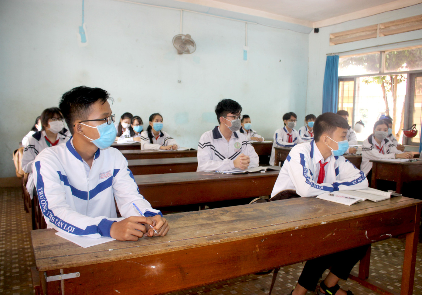 Tại trường THCS Tân Lợi công tác phòng chống dịch bệnh cũng được tiến hành nghiêm chỉnh. Ông Tạ Ngọc Kiểm-Hiệu trưởng trường chia sẻ, khi có quyết định cho học sinh khối lớp 9 đi học trở lại, ban giám hiệu chủ động triển khai phun dung dịch sát khuẩn, vệ sinh bàn ghế, đo thân nhiệt, đeo khẩu trang, rửa tay sát khuẩn, giữ khoảng cách an toàn cho học sinh an tâm tới trường. Nhà trường dành nguyên tiết chào cờ để thầy cô giáo hướng dẫn học sinh thực hiện quy định phòng chống dịch kể cả trong lớp học và giờ ra chơi, giữ khoảng cách theo khuyến cáo ngành y tế.