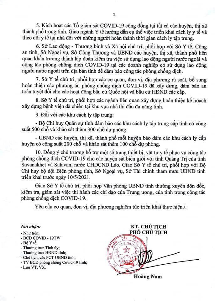 Đó là chỉ đạo của Phó Chủ tịch UBND tỉnh Quảng Trị Hoàng Nam, Phó Trưởng Ban Thường trực Ban Chỉ đạo phòng, chống COVID-19 tỉnh Quảng Trị tại cuộc họp trực tuyến Ban Chỉ đạo phòng, chống COVID-19 tỉnh diễn ra vào chiều tối 4/5.