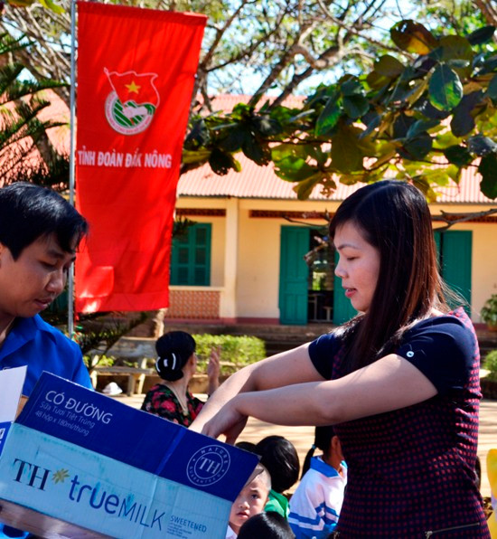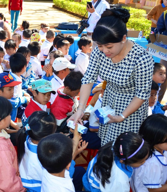 Sân trường tiểu học Nguyễn Viết Xuân ở xã Đắk Nia cách trung tâm thị xã Gia Nghĩa gần chục cây số suốt buổi trưa đã rộn rã tiếng cười nói của hàng trăm học sinh đến sớm, náo nức chờ dự lễ trao nhận sữa.