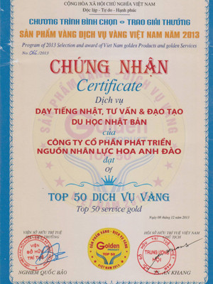 | Mới đây, 08/12/2013, Cục Sở hữu Trí tuệ phối hợp với Liên hiệp các hội KHKT Việt nam đã chỉ đạo việc bình chọn & trao tặng GIẤY CHỨNG NHẬN Dịch vụ Vàng về dạy tiếng Nhật; Tư vấn & Đào tạo du học Nhật Bản cho Công ty HOA ANH ĐÀO (ảnh). Trước đó, nhân ngày Doanh nhân Việt Nam 13/10/2013, nhà nước Việt Nam đã tặng TS. Lê Minh Tiến – Giám đốc Công ty HOA ANH ĐÀO Cúp vàng Doanh nhân Ưu tú Đất Việt. |