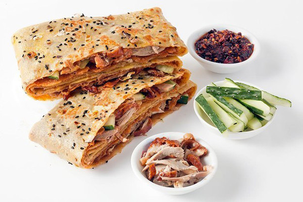 Bánh kẹp thịt vịt là sự sáng tạo giữa món thịt vịt trứ danh trên hè phố Bắc Kinh với lớp bánh bên ngoài gần như bánh tráng của Việt Nam. Món ăn này ăn kèm với dưa chuột thái lát và nước chấm cay ngọt tuyệt hảo.