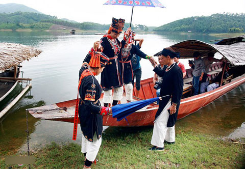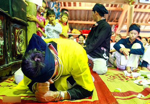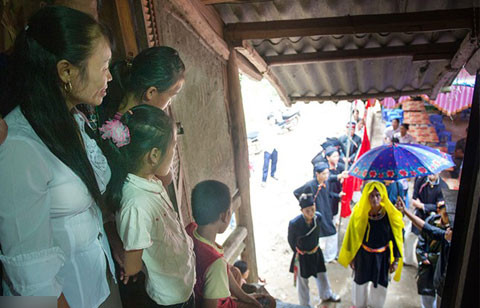 Về đến nhà trai, một phù rể ra cầm tay áo của cô dâu dẫn lên cầu thang bởi chú rể không được ra đón và cũng không được nhìn mặt cô dâu cho đến khi các nghi lễ lạy tạ tổ tiên được thực hiện xong.