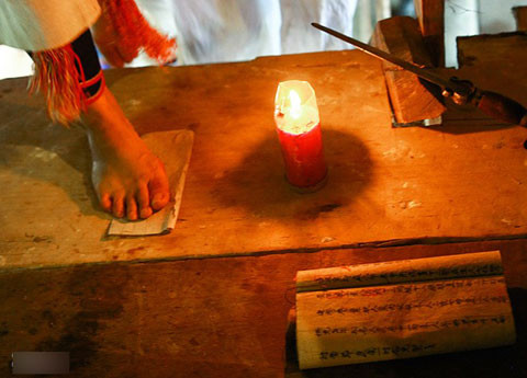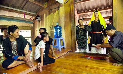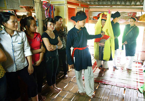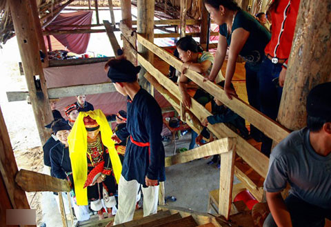 Thầy cúng đã chờ sẵn ở cửa và làm phép rửa chân cho cô dâu. Bước chân đầu tiên vào nhà chồng cô dâu phải bước chân phải. Họ cho rằng, có như vậy mới tránh được những điều rủi ro, cô dâu và chú rể mới sống hạnh phúc trăm năm.