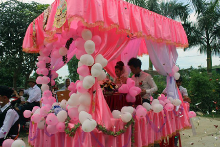Chú rể đã có màn gây ấn tượng với chiếc xe rước dâu mà máy cày ruộng. Chiếc máy cày được trang trí khoảng 200 quả bóng bay, thùng xe được che lọng lớn màu hồng; xung quang thùng xe cũng được phủ một lớp vải hồng. Phía đầu xe cũng được phủ vải hồng và đặt một lẵng hoa lớn màu tím cùng dòng chữ song hỷ.