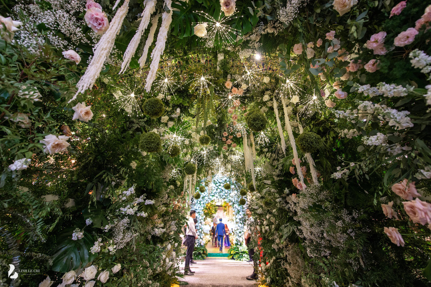 Tiệc cưới chiêu đãi khách mời diễn ra trong không gian sang trọng, được trang trí bằng bộ ảnh cưới của cặp đôi chụp tại châu Âu và rất nhiều hoa tươi. Khoảnh khắc cô dâu bật khóc trước khi được bố dắt tay tiến vào lễ đường, cùng với hình ảnh ngọt ngào của cả hai ngay trong hôn lễ đã nhận được sự chú ý đặc biệt từ khán giả.