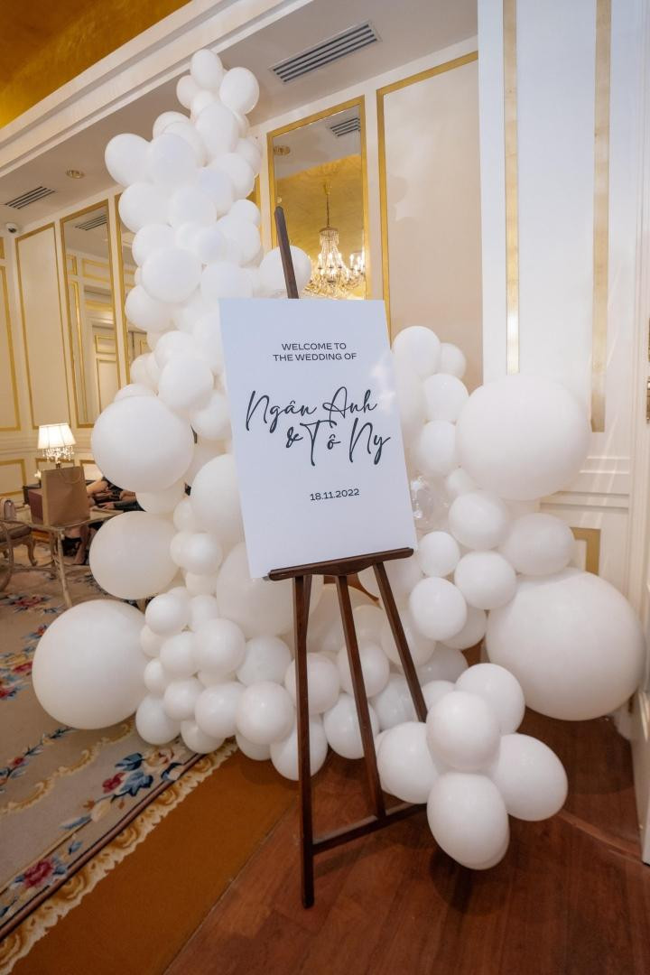 Tiệc cưới của Hoa hậu Lê Âu Ngân Anh và BTV/ MC truyền hình Phan Tô Ny được tổ chức tại một nhà hàng sang trọng nằm ở trung tâm TP.HCM. Không gian hôn lễ lấy tông trắng - vàng làm chủ đạo, được trang trí bởi hoa baby, bóng bay và những bức ảnh lưu niệm của hai vợ chồng.