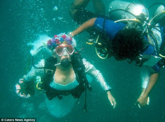Đối với hầu hết các cô dâu, ướt sũng trong bộ váy cưới là thảm họa vô cùng nhưng Janet lại cảm thấy vô cùng hạnh phúc. Là những người thích lặn, đã ở bên cạnh nhau 20 năm nên Chris và Janet luôn ước mơ ngày cưới của mình sẽ diễn ra tại vùng biển ấm áp dưới Ấn Độ Dương. Và cặp đôi đã thực hiện điều đó cách đây ít ngày.